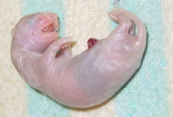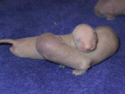 Bei der Geburt sind die Welpen ca. 5-10 cm groß und wiegen zwischen 5-15 Gramm. Größe und Gewicht variieren natürlich von Wurf zu Wurf. Bei kleineren Würfen sind die Welpen oft schwerer und größer und bei größeren Würfen umgekehrt.Die Welpen sind jetzt noch nackt, taub und blind.